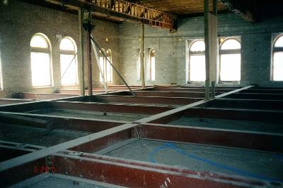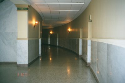 ![]() Atrium view from the hallway Closeup | ![]() View of first floor hallway after restoration | ![]() View of third hallway not yet restored |
